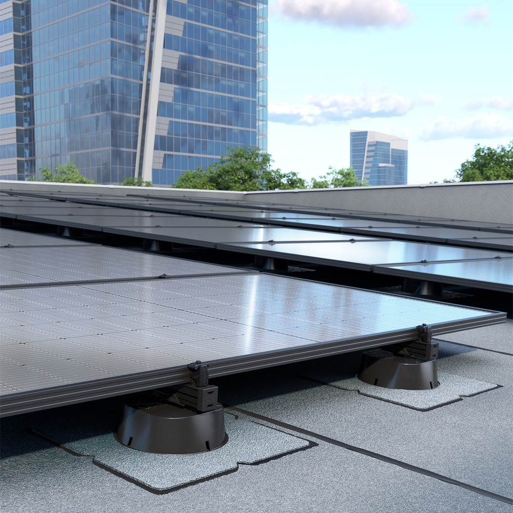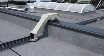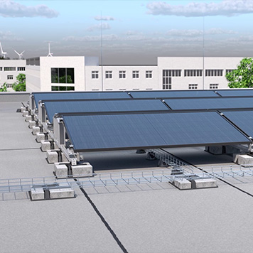 Vårt Basic-system for flate tak kan belastes sterkt og er raskt å montere. Det kjennetegnes av et integrert system for kabellegging og samtidig ballastering. Systemets utforming er trinnløst takket være det fleksible mønegapet.