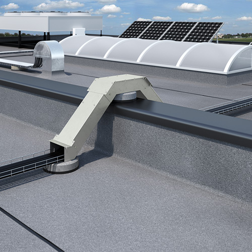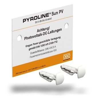 OBO brannvernkanal egner seg til dette PYROLINE® Sun PV. Installasjonskanalen av glassfiberforsterket lettbetong har en ikke-strømførende overflate som gir beskyttelse mot farlige berøringsspenninger ved brann. Dessuten oppfyller den kravene til bruksregelen VDE AR-N-E-2100-712 på brannsikre og berøringssikre installasjoner. Dermed foreligger det også en beskyttelse mot elektriske støt ved slukkearbeider for innsatskreftene. En annen fordel: Kanalen kan dermed legges utendørs. Den egner seg fremfor alt til etterfølgende innkapsling av allerede installerte likestrømsledninger, ettersom den fleksibelt lar seg tilpasse ledningsveiene. Lynvernanlegget må bygges i skilleavstand. Installasjon direkte på veggen eller taket. Med egnede skjøtebeslag er også nedhengt montasje mulig.