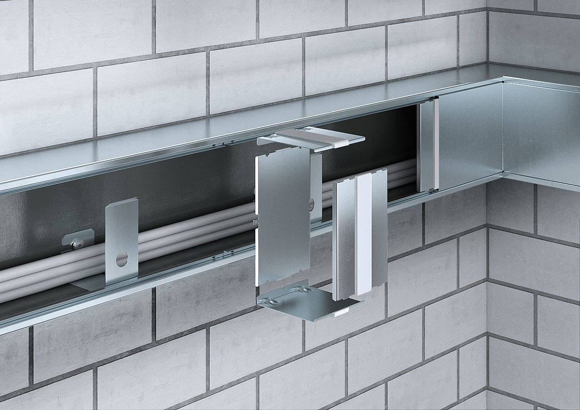Installasjon og montering foretas ekstra fleksibelt og estetisk med PYROLINE® Rapid PLM: Ved siden av den vanlige monteringsmåten med en forskyvning mellom støtpunktet til kanaltrauet og støtpunktet til kanaldekslet, kan også montering i hjørnet av et rom eller med nullavstand mellom to kanaler omsettes med den patenterte koblingsteknikken. Koblingssettet kommer i en verktøyfri utførelse, slik at det ikke trengs noen ekstra skruer eller fester på underlaget.