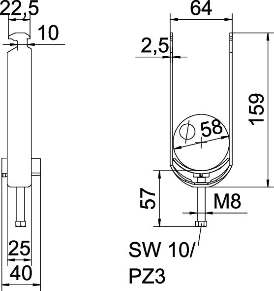 ProduktbeskrivelseBøyleklammer med hammerhode-fot, enkel, med trykkbrakett av polypropylen. For vertikal og horisontal montering av 2 enkeltkabler til C-profilskinne. For slisselengde 16–17 mm. Med 1-gjenget skrue på trykkbrakett, universal sekskantskruehode SW10, med spor og tverrspor. Egnet for montering innendørs og i uteområder. Flere kables skal skilles med dobbeltbraketter. Bruk av en motbrakett anbefales.