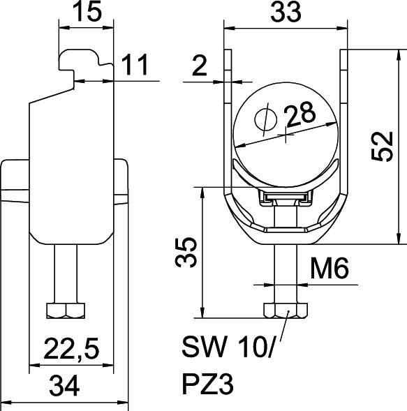 ProduktbeskrivelseBøyleklammer med N-fot, enkel, med trykkbrakett av polypropylen. For vertikal og horisontal montering av 1 enkeltkabel til C-profilskinne. For slisselengde 11–12 mm. Med 1-gjenget skrue på trykkbrakett, universal sekskantskruehode SW10, med spor og tverrspor. Egnet for montering innendørs og i uteområder. Bruk av en motbrakett anbefales.