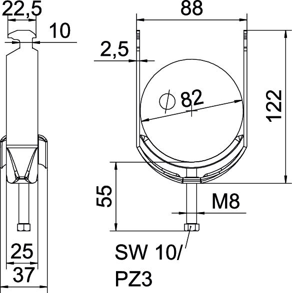 ProduktbeskrivelseBøyleklemme med hammerhode-fot, med trykkbrakett av metall med rundede kanter for kabelvern. For vertikal og horisontal montering av 1 enkeltkabel til C-profilskinne. For slisselengde 16–17 mm. Med 1-gjenget skrue på trykkbrakett, universal sekskantskruehode SW10, med spor og tverrspor. Egnet for montering innendørs og i uteområder. Motbrakett må bestilles separat.