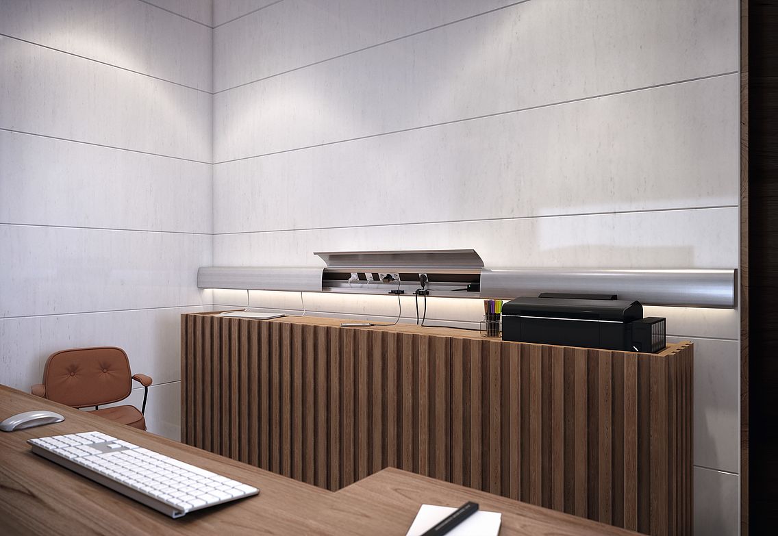 Det diskrete kvalitetsutseendet til GAD-kanalen forstyrres ikke av plugger, strømdeler eller data- og nettverkstilkoblinger. For disse forsvinner bak det svingbare kanaldekselet. Dekselet kan klikkes på plass når det er åpent, og er tilgjengelig i tre forskjellige former: rett, konveks eller buet. Slik tilpasser de seg fleksibelt til de respektive installasjonsforholdene.