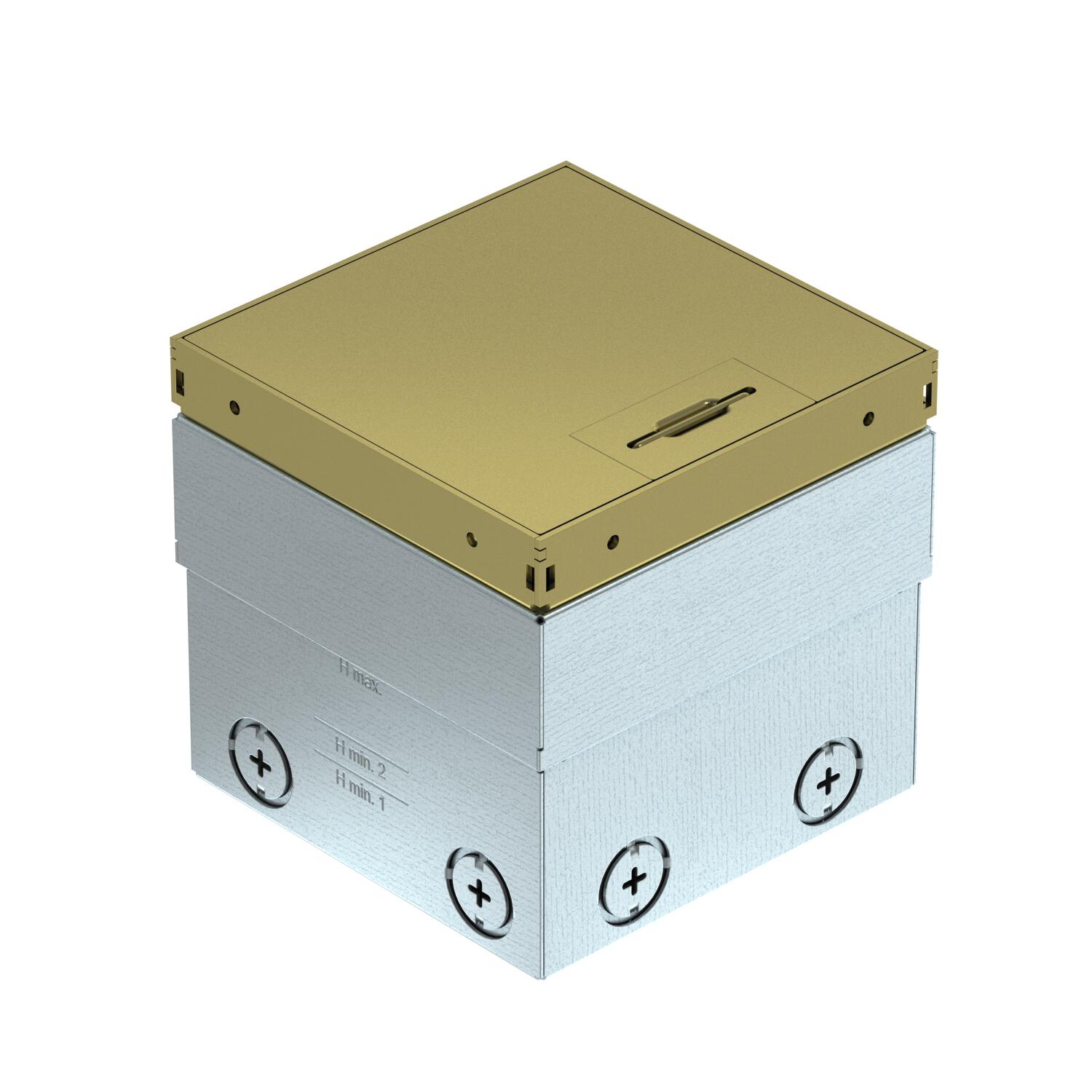 Ramme og lokk i messing som er synlig i gulvet. Tomt hus for inntil 2 Modul 45®-ledningsuttak i monteringsbraketten og 2 datakontakter i den valgfrie datateknikkholderen. Belastningsevnen på 15 kN er kun garantert i ubenyttet tilstand.