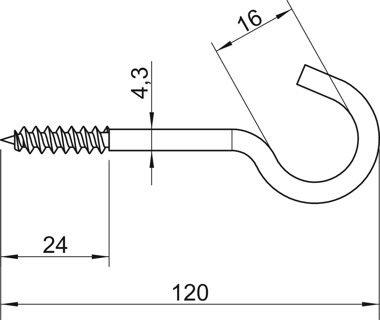 Bruddlast 0,2 kN Dimensjon 4,2x120mm Gjengelengde 24 mm Krokdiameter 16 mm Lengde 120 mm Mål L 120 mm Mål L1 24 mm Materialdiameter 4,3 mm Materiale stål Overflate galvanisert Plastmantlet nei - Alle typer