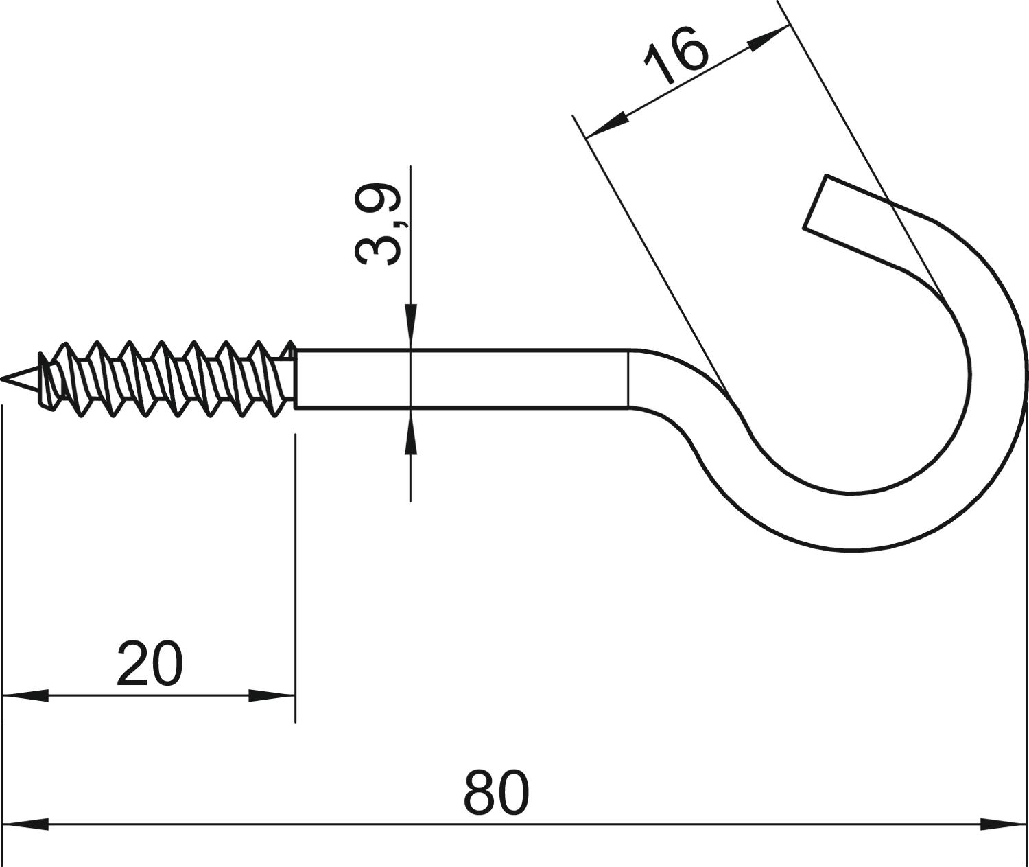 Bruddlast 0,15 kN Dimensjon 3,9x80mm Gjengelengde 20 mm Krokdiameter 16 mm Lengde 80 mm Mål L 80 mm Mål L1 20 mm Materialdiameter 3,9 mm Materiale stål Overflate galvanisert Plastmantlet nei - Alle typer